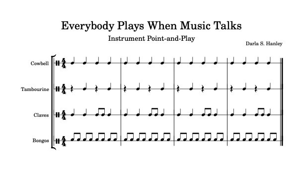 This teaching strategy is called “Everybody Plays”. The track for this instrument play, “Music Talk” is available on multiple streaming audio platforms. (Like many of my teaching strategies, you should feel free to find other audio tracks to anchor the learning experience using music that works in your setting or new tracks to “mix it up.”)