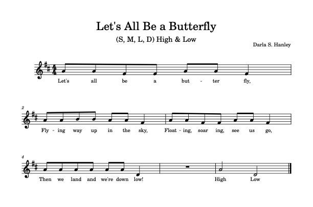 This teaching strategy is all about singing, having a great time with dramatic play, and exploring the musical concepts of high and low. It goes with an original song titled “Let’s All Be a Butterfly” (music notation below).