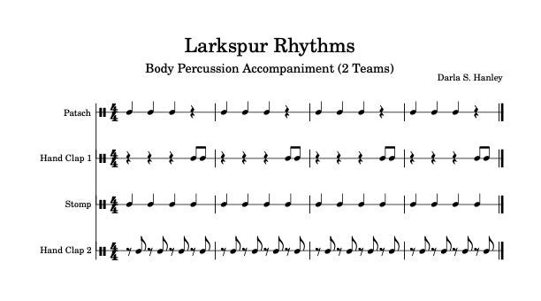 To create our accompaniment we will use 3 types of body percussion: 1) clapping, 2) stomping, and 3) patsching (tapping our thighs). Let’s read the “Larkspur Rhythms” notation and perform the body percussion—without a track to get started.